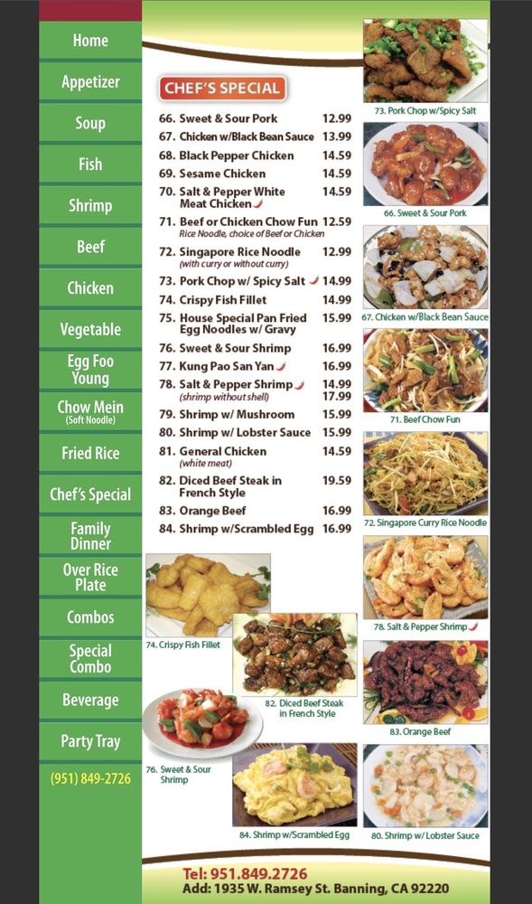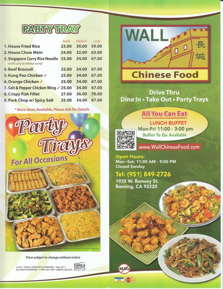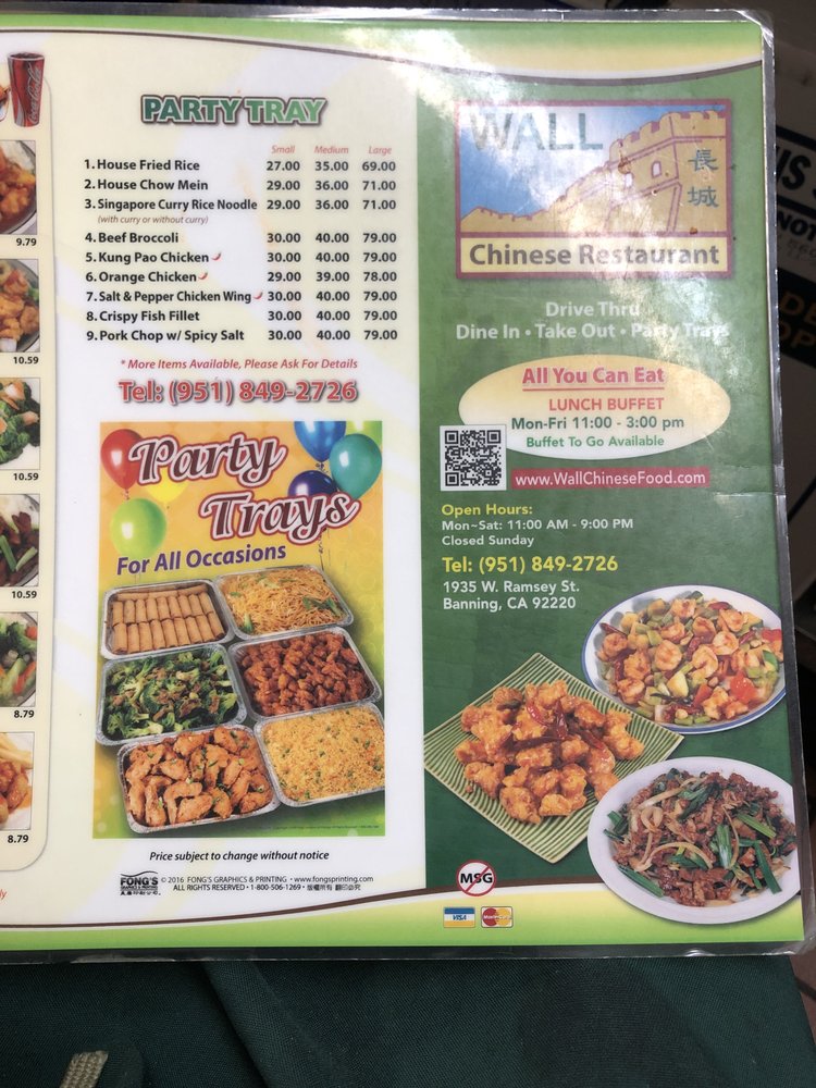 Wall Chinese Restaurant is a popular Chinese eatery located at 1935 W Ramsey St Banning, CA 92220. This establishment offers a wide range of amenities including takeout, reservations, delivery, wheelchair accessibility, credit card acceptance, and more. The menu at Wall Chinese Restaurant caters to a variety of preferences, making it an ideal spot for lunch, dinner, or group gatherings. With options for outdoor seating, catering, and happy hour specials, there is something for everyone to enjoy. The restaurant also provides Wi-Fi, alcohol, and TV for a complete dining experience. Don't miss out on the delicious dishes and friendly service that make Wall Chinese Restaurant a standout choice for Chinese cuisine enthusiasts.
